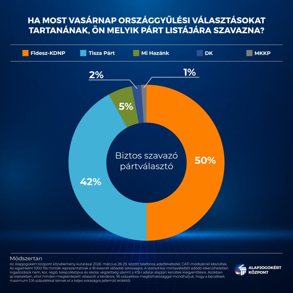 A biztos szavazók fele a Fidesz–KDNP-re voksolna egy most vasárnap tartott választáson, míg a Tisza Párt 42 százalékon áll az Alapjogokért Központ kutatása szerint. A részvételi hajlandóság 74 százalékra nőtt. A kisebb pártok közül a Mi Hazánk 5, a DK 2, az MKKP 1 százalékon áll.