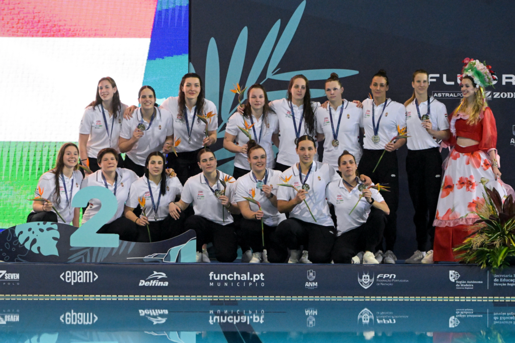 Fotó: Az ezüstérmes magyar csapat a női vízilabda Európa-bajnokság eredményhirdetésén a funchali Olimpiai Uszodakomplexumban –MTI/Szigetváry Zsolt