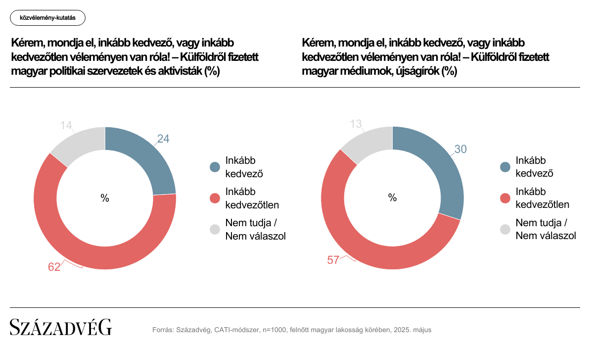A felmérés szerint a megkérdezettek 62 százaléka kedvezőtlen véleményen van a külföldről fizetett politikai szervezetekről és aktivistákról, míg 24 százalékuk pozitívan vélekedett róluk, szögezte le felmérésében a Századvég.