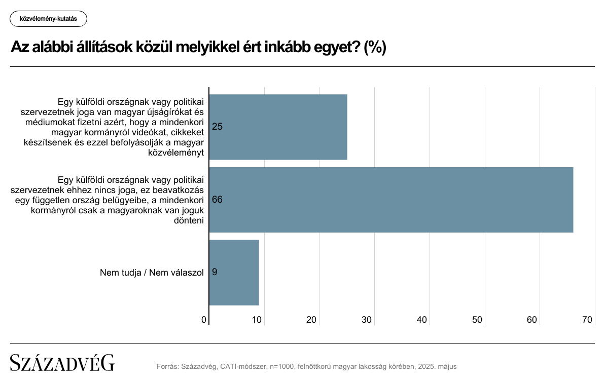 a magyarok kétharmada (66 százaléka) egyetért azzal az állítással, hogy egy külföldi országnak vagy politikai szervezetnek nincs joga magyar újságírókat és médiumokat fizetni azért, hogy a mindenkori magyar kormányról videókat, cikkeket készítsenek – annak céljait támadva és hiteltelenítve azokat – és ezzel befolyásolják a közvéleményt, ugyanis ez beavatkozás egy független ország belügyeibe” – olvasható a felmérésben.