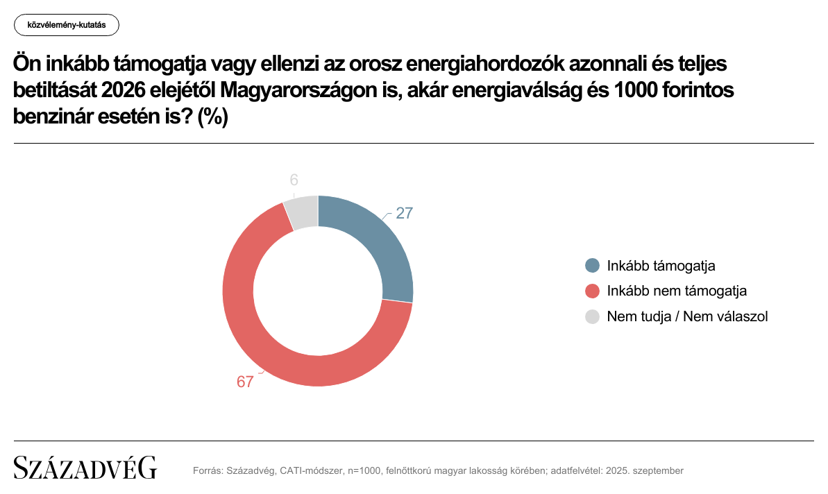 Az embargó okozta károk tükrében érthető, hogy a magyar felnőtt lakosság többsége elutasítja az intézkedést. A Századvég októberi felmérése alapján kétharmaduk ellenzi, és mindössze negyedük támogatja az orosz olaj és gáz 2026-os tilalmát.