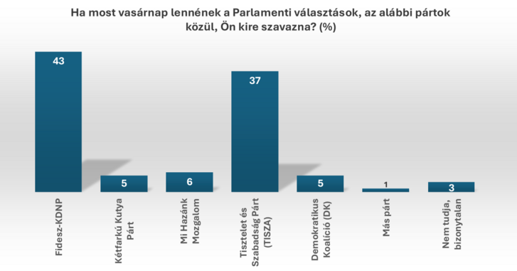 a kormánypártok jelenleg 43 százalékponton állnak, míg a Tisza Párt 37 százalékponton.
