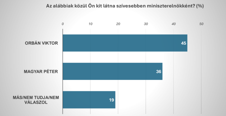 a válaszadók 45 százaléka a jelenleg regnáló Orbán Viktort válaszolta, míg 36 százalékuk Magyar Pétert.