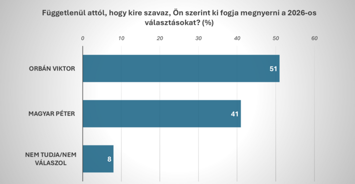 A magyarok 51 százaléka gondolja így, míg további 41 százalékuk szerint a választások után Magyar Péter tölti be a miniszterelnöki pozíciót. Azok aránya, akik nem tudják, vagy nem válaszoltak, 8 százalékpont.