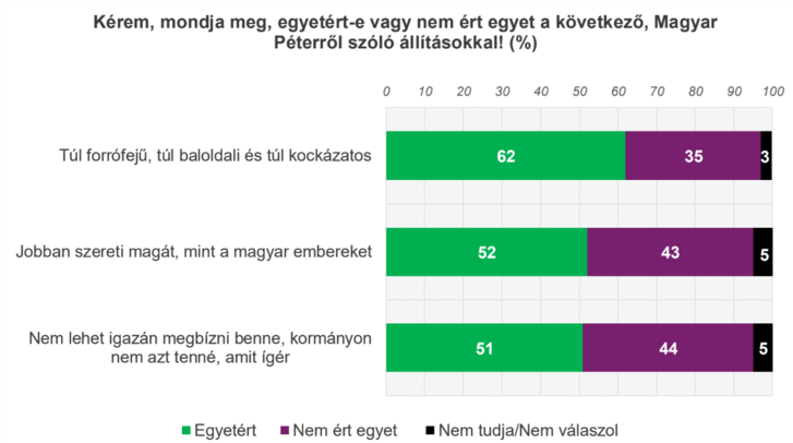 A válaszadók többsége szintén úgy gondolja, hogy Magyar Péter jobban szereti önmagát, mint a magyar embereket (52 százalék ért egyet ezzel, 43 nem, 5 bizonytalan), valamint hogy nem lehet benne megbízni, mert kormányon nem azt tenné, amit ígér: utóbbi állítással a válaszadók 51 százaléka értett egyet, 44 százaléka nem, míg öt százalékuk nem tudta eldönteni, vagy nem kívánt válaszolni.