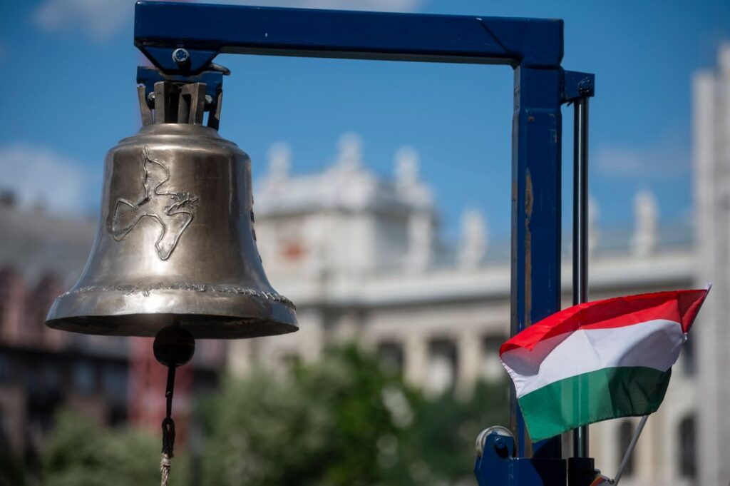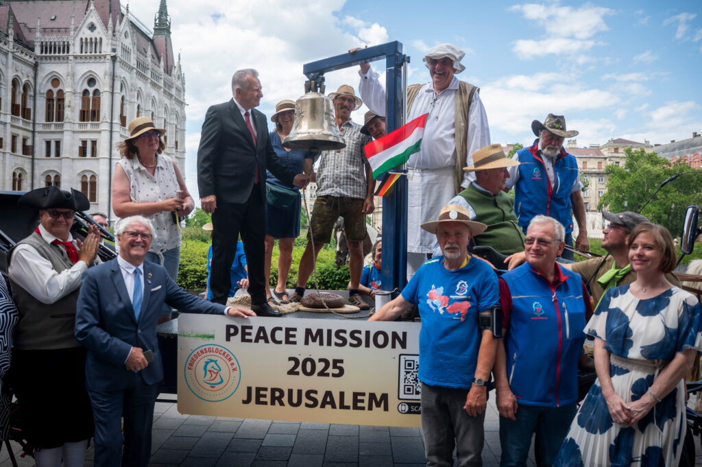 Címlapkép: Budapest, 2025. június 29. A békeharang a Békeharang 2025 misszió delegációjának fogadásán a Parlament előtt 2025. június 29-én. A katonai fémhulladékból öntött harangot lovasszekéren viszik a béke és a vallások közötti párbeszéd népszerűsítése érdekében Berlinből Jeruzsálembe. A több szekérből álló menet május 8-án a II. világháború európai lezárásának napján indult, és várhatóan karácsonyra érkezhet meg Jeruzsálembe. MTI/Balogh Zoltán