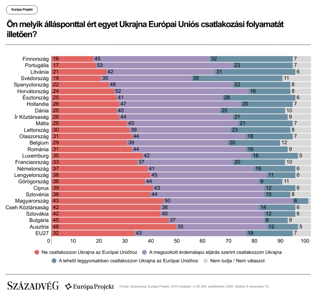 Az uniós polgárok többsége valamennyi tagállamban elutasítja a brüsszeli törekvést. A Századvég legfrissebb Európa Projekt-kutatása rámutat, hogy a felnőtt lakosság mindössze 18 százaléka venné fel azonnal Ukrajnát az EU-ba, 43 százalékuk szerint inkább be kellene tartani a megszokott érdemalapú eljárást, 32 százalékuk pedig teljesen elutasítja az ország csatlakozását.