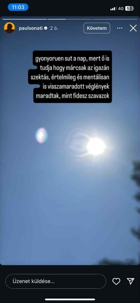 Az énekes egy napsütéses fotót tett közzé történetében, amire azt írta: „Gyönyörűen süt a Nap, mert ő is tudja, hogy már csak az igazán szektás, értelmileg és mentálisan is visszamaradott véglények maradtak, mint Fidesz-szavazók”.