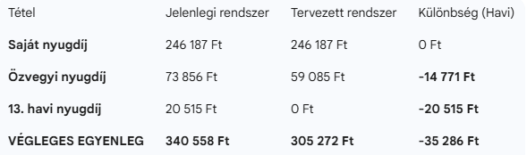 A helyzet még súlyosabb, ha a nyugdíjas teljes állásban dolgozik: számításaink szerint a saját nyugdíja 246 187 forint (nettó), az özvegyi nyugdíj a saját nyugdíj 30 százaléka, 73 856 forint, a bruttó munkabér 687 100 forint (2025. szeptember, KSH), a 13. havi nyugdíjat pedig havi átlagban 20 515 forintot veszítene el a tervezett intézkedések szerint.