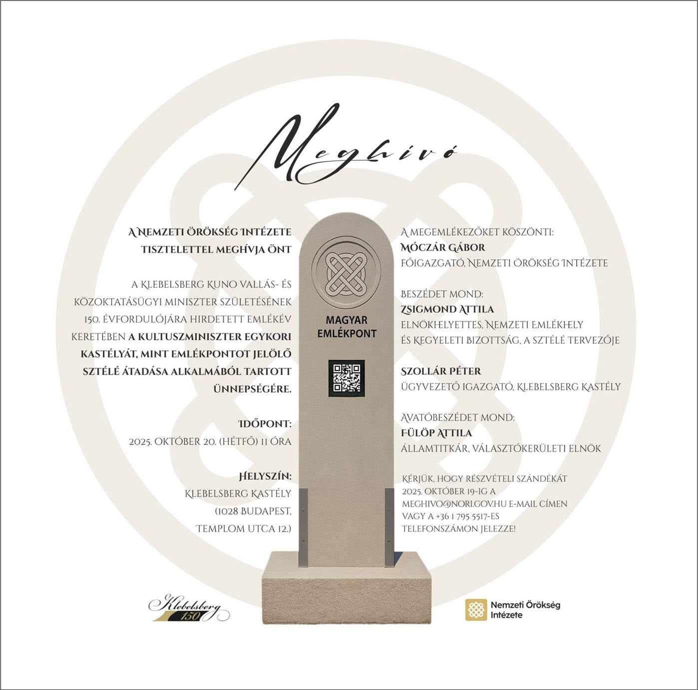 A Klebelsberg Kuno vallás- és közoktatásügyi miniszter születésének 150. évfordulójára hirdetett emlékév keretében a kultuszminiszter egykori kastélyát, mint emlékpontot jelölő sztélé átadása alkalmából a Nemzeti Örökség Intézete ünnepséget tart.