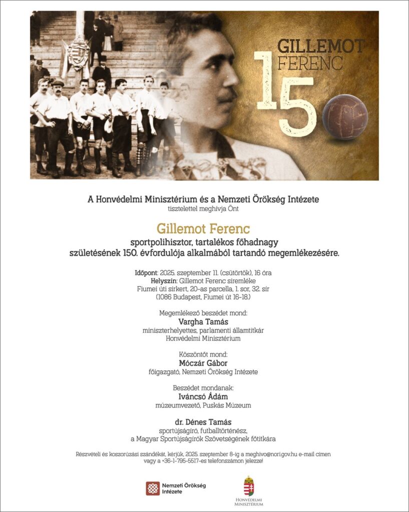 A Honvédelmi Minisztérium és a Nemzeti Örökség Intézete Gillemot Ferenc sportpolihisztor, első világháborús főhadnagy születésének 150. évfordulója alkalmából megemlékezést tart.