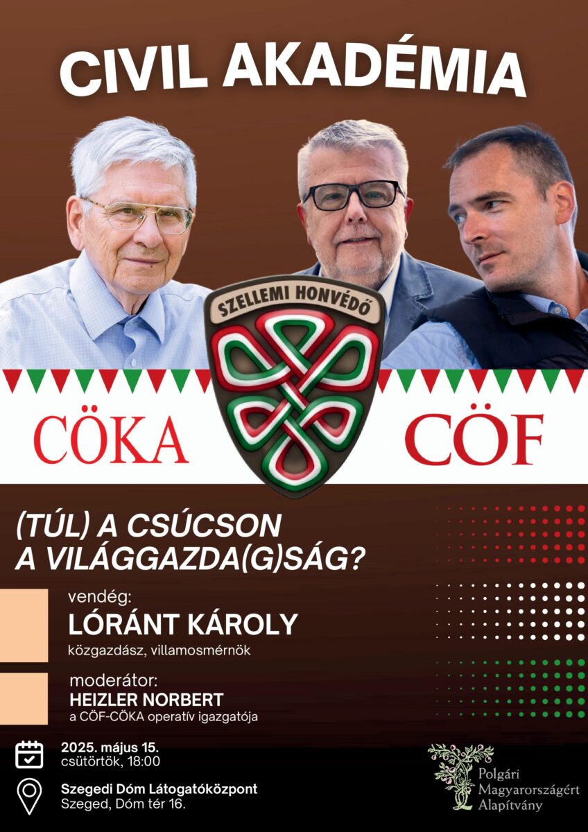 Csizmadia László, a CÖF-CÖKA elnökének meghívására Lóránt Károly közgazdász, villamosmérnök lesz a Civil Akadémia vendége. Az est címe: (Túl) a csúcson a világgazda(g)ság?