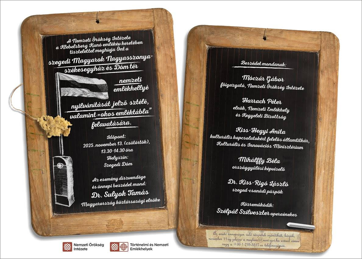 A Nemzeti Örökség Intézete a Klebelsberg Kunó emlékév keretében tisztelettel meghívja Önt a szegedi Magyarok Nagyasszonya-székesegyház és Dóm tér nemzeti emlékhellyé nyilvánítását jelző sztélé, valamint „okos emléktábla” felavatására.