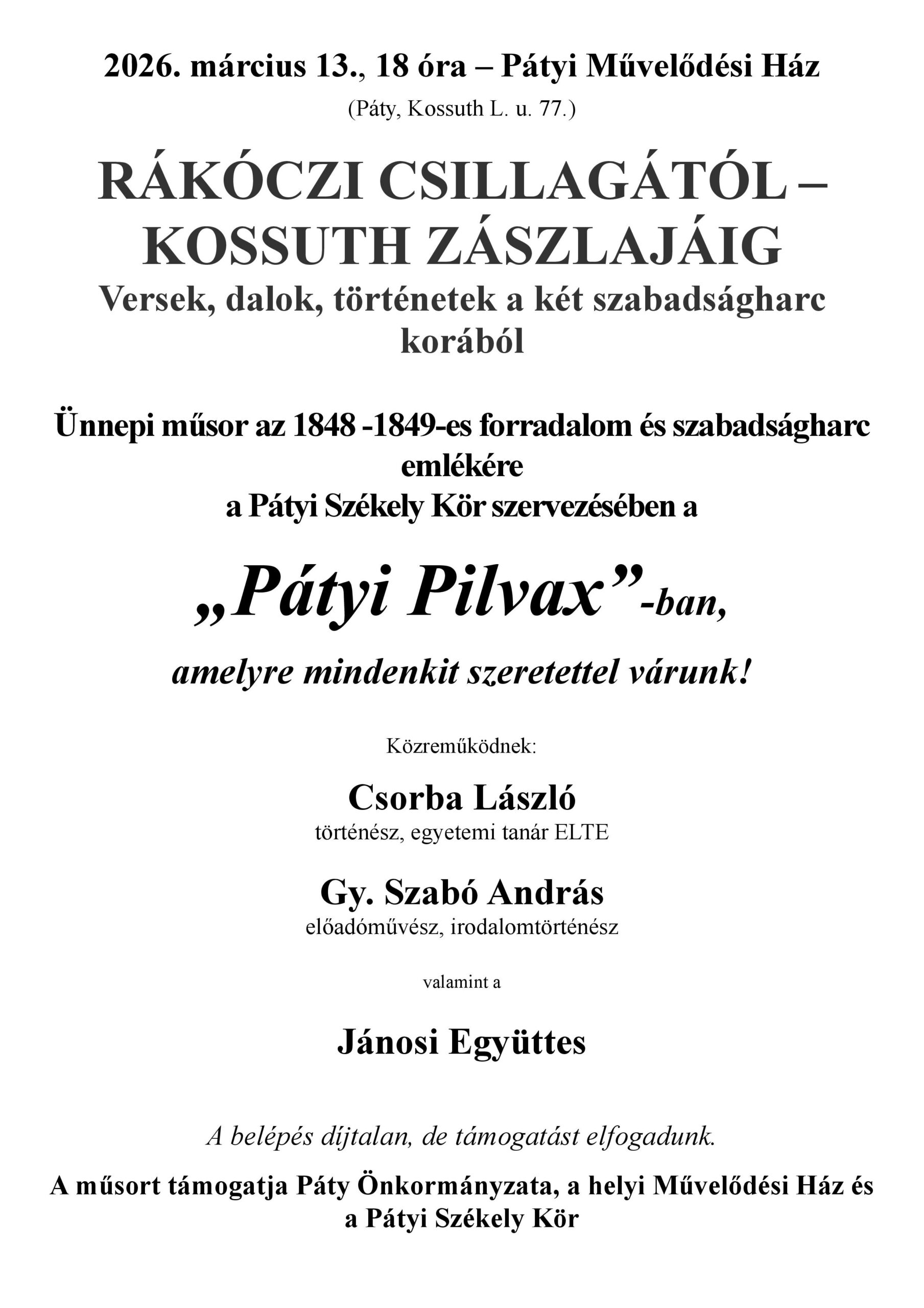 2026. március 13., 18 óra – Pátyi Művelődési Ház (Páty, Kossuth L. u. 77.)