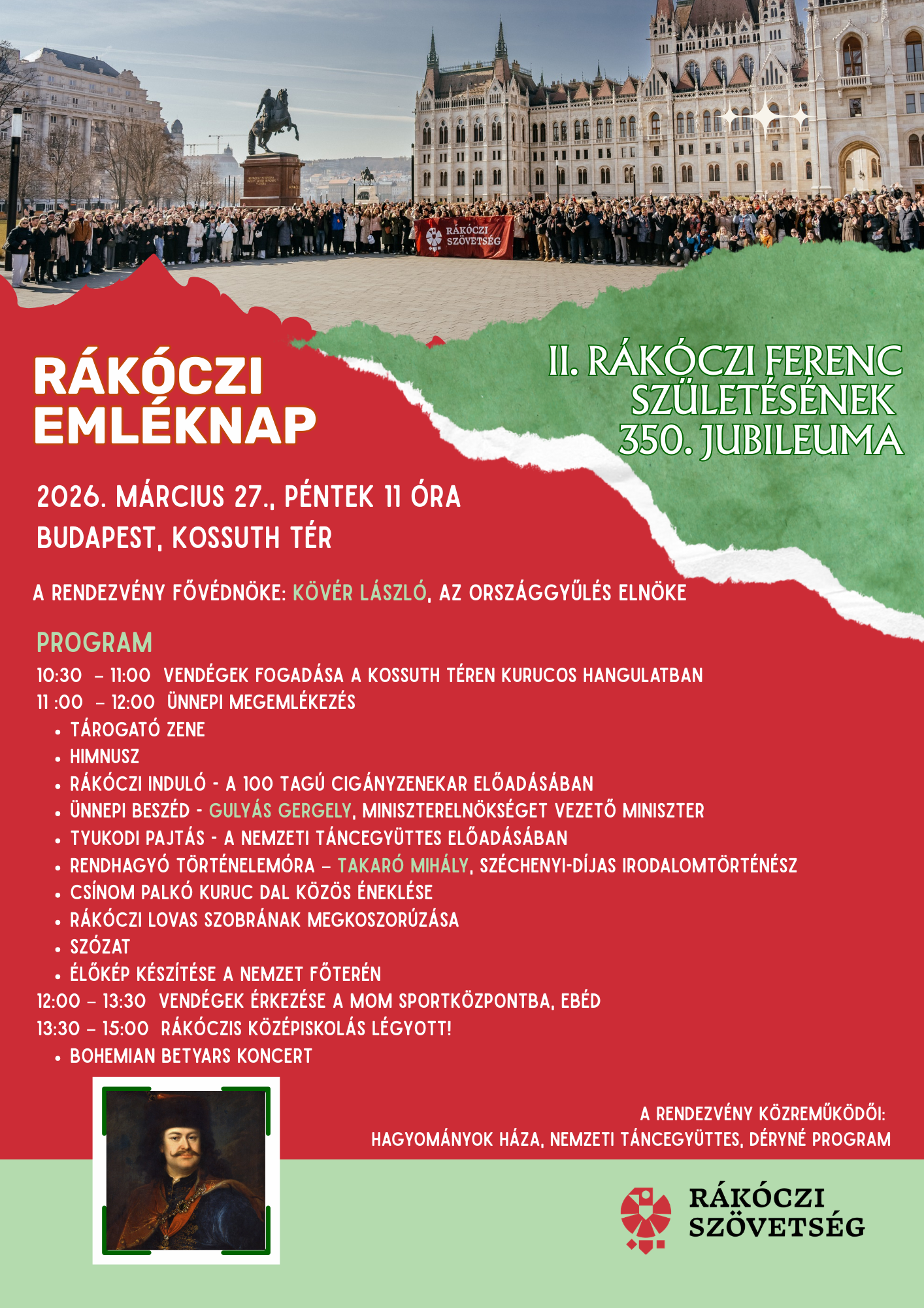 A Rákóczi Szövetség március 27-én, pénteken 11 órakor a Kossuth téri lovasszobornál emlékezik névadójának, II. Rákóczi Ferenc születésének 350. jubileumára.