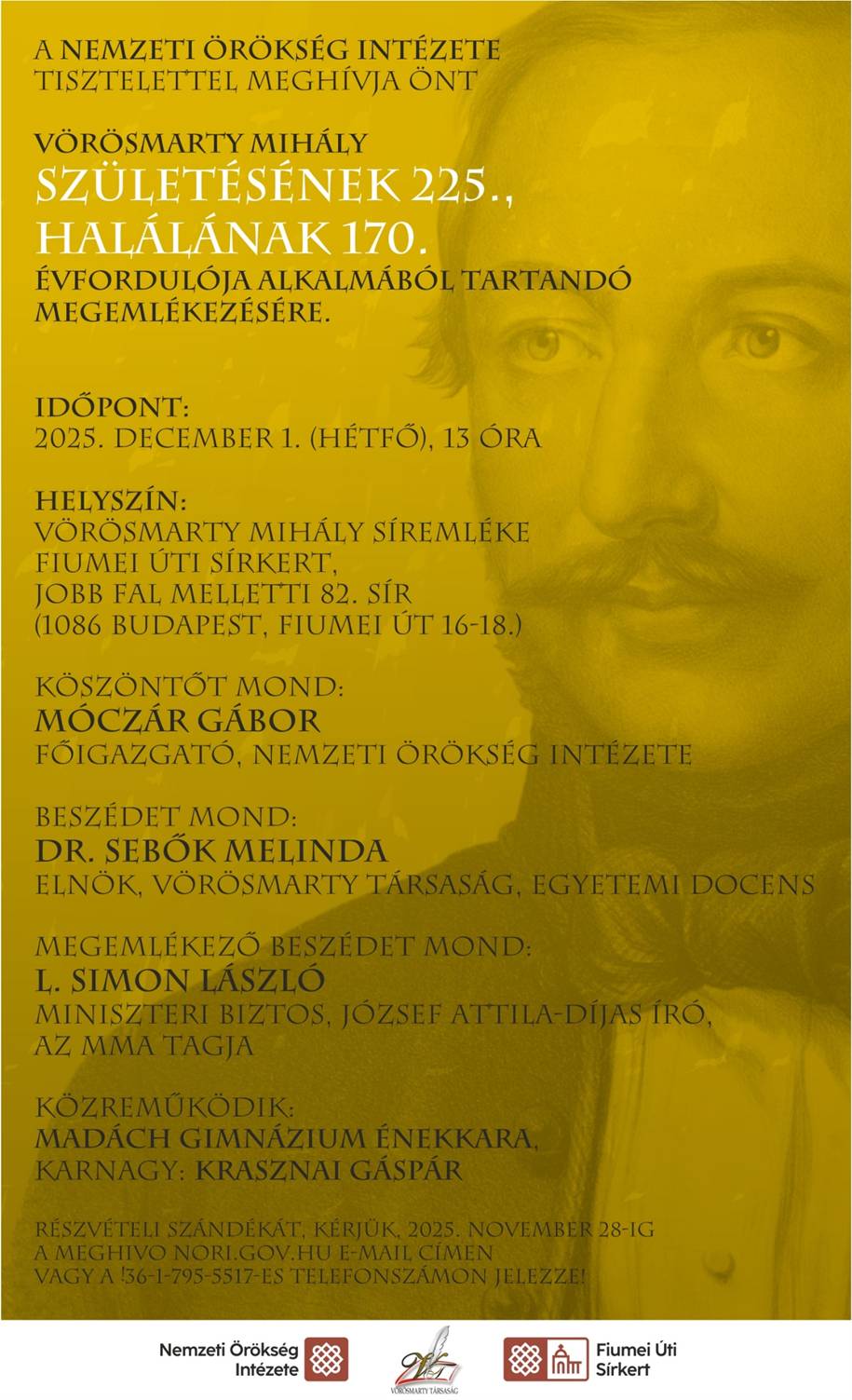 A Nemzeti Örökség Intézete megemlékezést tart Vörösmarty Mihály születésének 225., halálának 170 évfordulója alkalmából.