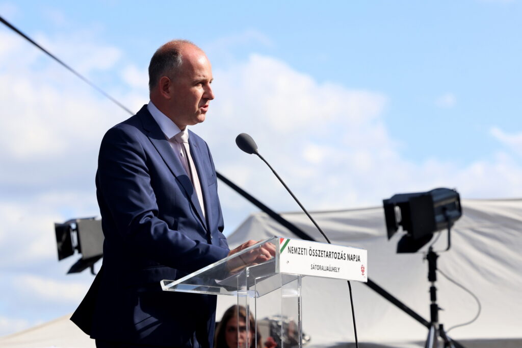 Címlapkép: Panyi Miklós, a Miniszterelnökség parlamenti és stratégiai államtitkára beszédet mond a sátoraljaújhelyi Rákóczi táborban, a nemzeti összetartozás napja alkalmából tartott megemlékezésen 2025. június 3-án.
