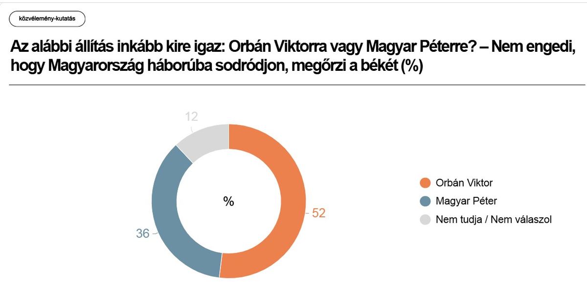 A többség (52 százalék) szerint Orbán Viktor nem engedné háborúba sodródni az országot, és ő meg tudná őrizni a békét. Magyar Péterről ezt csak 36 százalék feltételezi. Arra a kérdésre, hogy a miniszterelnök és kihívója közül melyik politikust tartják a magyarok kockázatos választásnak, és kinél nem tudják, hogy mi történne, ha ő vezetné az országot, szintén egyértelmű válasz érkezett.