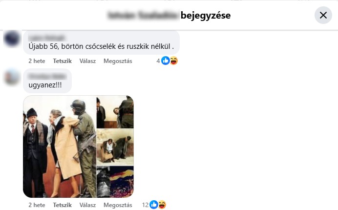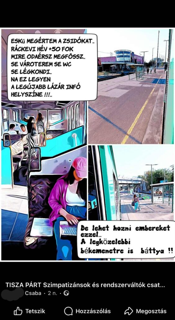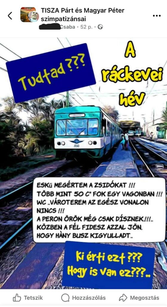 A Tisza Párt Szimpatizánsok és rendszerváltók csatlakozzatok elnevezésű csoportban szintén fellelhető egy kép, amelyen a holokauszttal viccelődik Magyar Péter egyik elkötelezett támogatója, hasonlóan egy másik, egy nappal korábbi bejegyzéshez. Egy több mint húszezer tagot számláló közösségben a zsidók módszeres lemészárlása és a HÉV-en tapasztalható hőség közé tett egyenlőségjelet egy Magyar Péter-szimpatizáns.