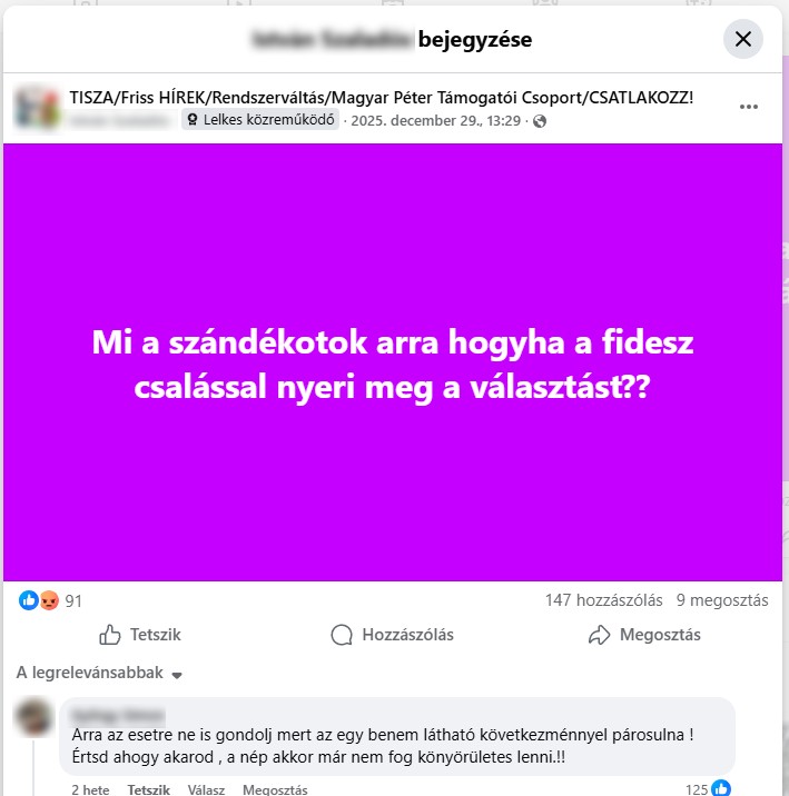 A kormánypártok választási győzelmét vetítették előre a Tisza Párt támogatóit tömörítő, több mint harmincezer tagot számláló Facebook-csoportban. A bejegyzésre, amely előre magyarázva a Tisza Párt vereségét választási csalásról értekezik, számos agresszív komment érkezett, amelyet hetek óta nem tüntettek el a csoport adminisztrátorai.