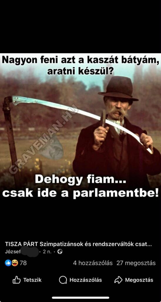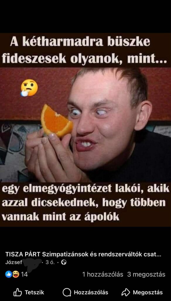 A Tisza Párt elkötelezett támogatói viccesnek ható képekkel igyekeznek emberi mivoltukban megalázni a kormánypárti szavazókat, illetve politikusok megölésére buzdítanak. A tartalmak több napig is megtalálhatók a Tisza Pártot támogató, több mint 16 ezer főt számláló csoportban.