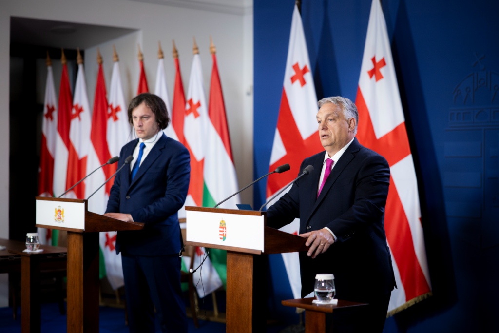 Címlapkép: A Miniszterelnöki Sajtóiroda által közreadott képen Levan Davitashvili, Georgia miniszterelnök-helyettese fogadja Orbán Viktor kormányfőt (középen, b-j) a tbiliszi repülőtéren 2024. október 28-án.