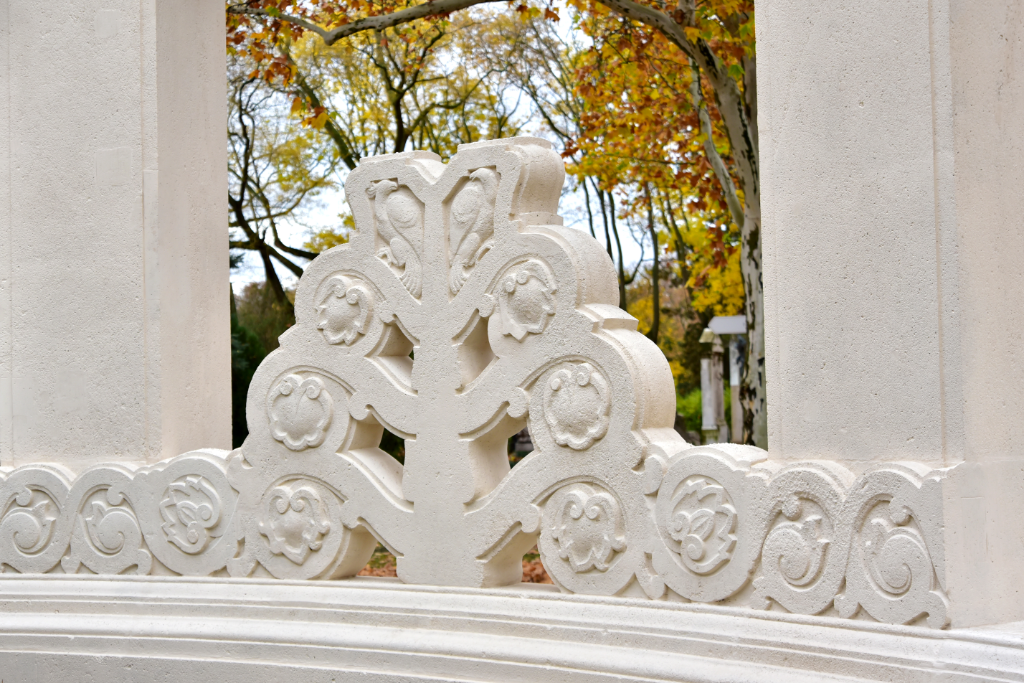 Elindulunk megnézni a síremléket, amelynek megtisztított mészkőelemei már messziről világítanak. Az idei munkálatok során a restaurátorok teljesen visszabontották a falakat, a kőelemeket felújították, ahol hiányzott elem, azt az eredetivel megegyező építőanyaggal pótolták.