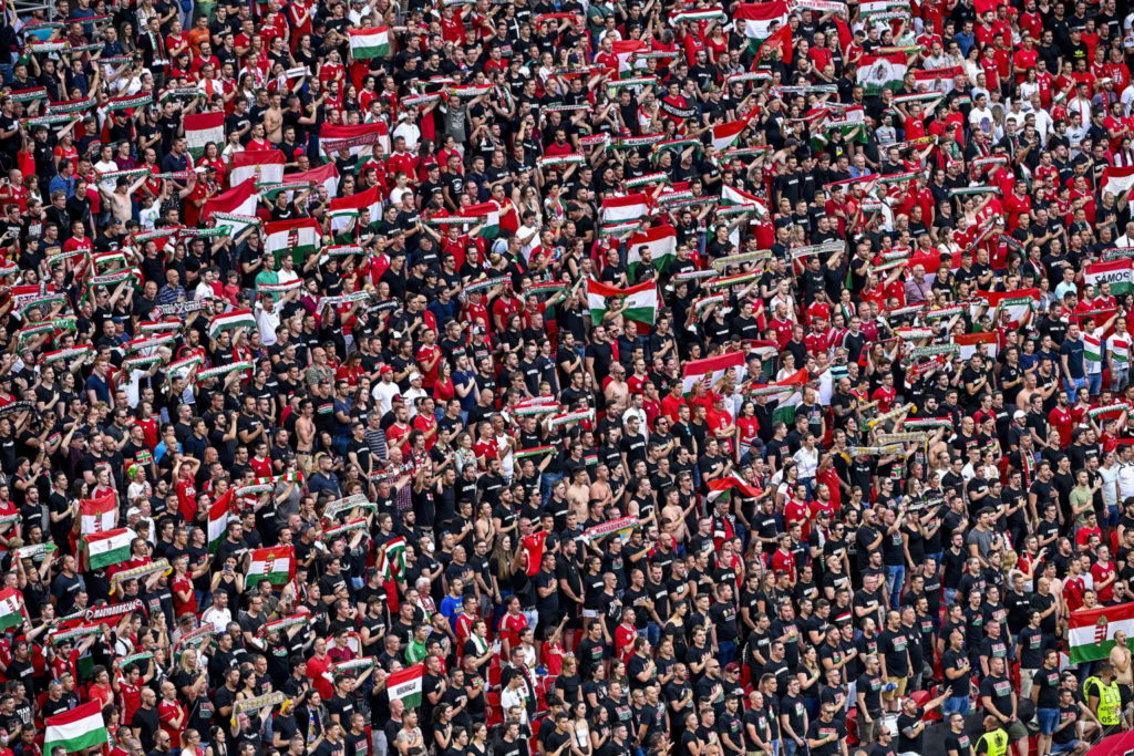 Jumătate a piros pólókba öltözött magyar szurkolókkal zsúfolt lelátók miatt a Puskás Arénát egy erős szívként dobogó teljesen piros oválisnak látta.