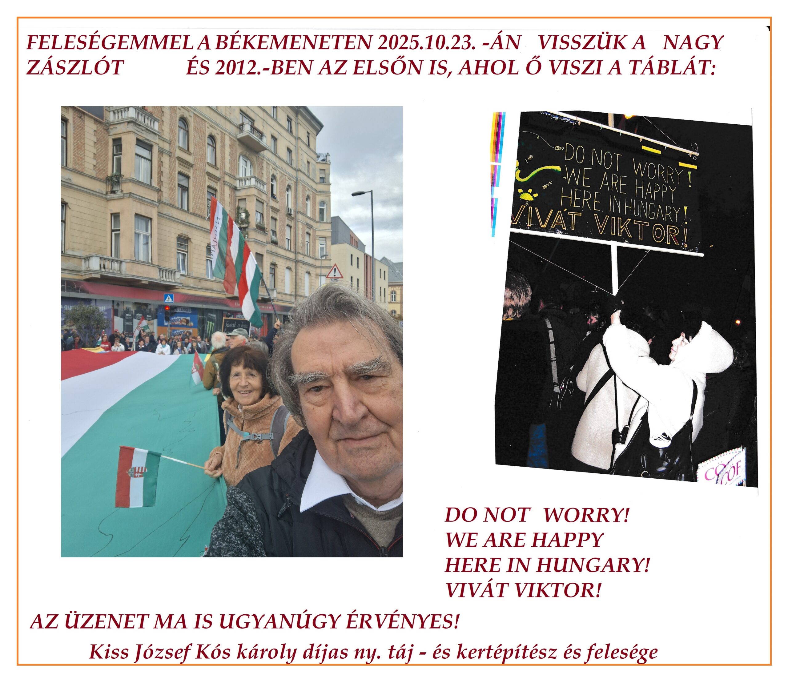 Az alábbi sorokban Kiss József, Kós Károly-díjas nyugalmazott táj- és kertépítész, valamint felesége fejezik ki hálájukat a Békemenet szervezőinek, résztvevőinek és a kormány tagjainak a rendezvény lebonyolításáért és üzenetéért.