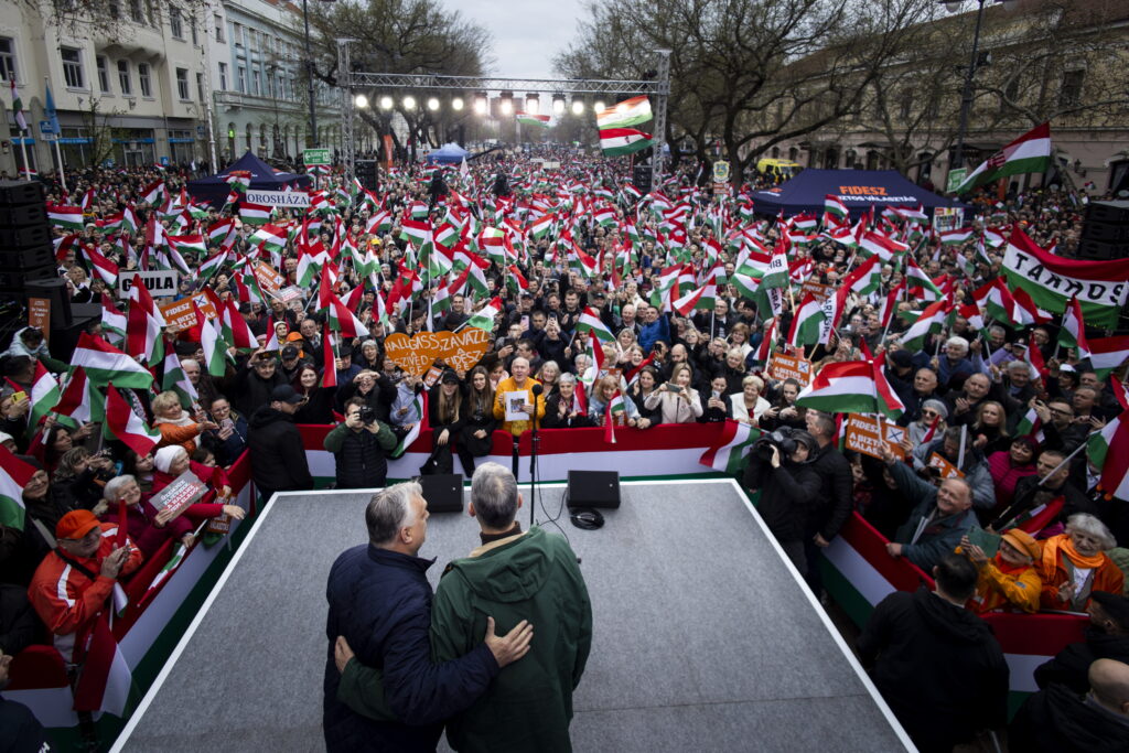 Borítókép: Orbán Viktor miniszterelnök, a Fidesz elnöke (b) országjárásának békéscsabai állomásán, mellette Lázár János építési és közlekedési miniszter (j) a Szent István téren 2026. március 29-én – Fotó: Miniszterelnöki Kommunikációs Fõosztály/Fischer Zoltán