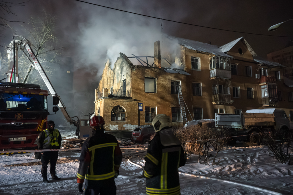 Fotó: Orosz légicsapásban találatot kapott lakóépületet oltanak Kijevben 2026. január 9-én pirkadat előtt – MTI/EPA/Makszim Marusenko