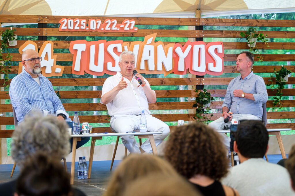 Kelemen Hunor, a Romániai Magyar Demokrata Szövetség elnöke, Semjén Zsolt miniszterelnök-helyettes és Pataky István, a Maszol.ro hírportál fõszerkesztõ-helyettese (b-j) a 34. Bálványosi Nyári Szabadegyetem Választások elõtt-után címmel rendezett pódiumbeszélgetésen az erdélyi Tusnádfürdõn 2025. július 24-én.