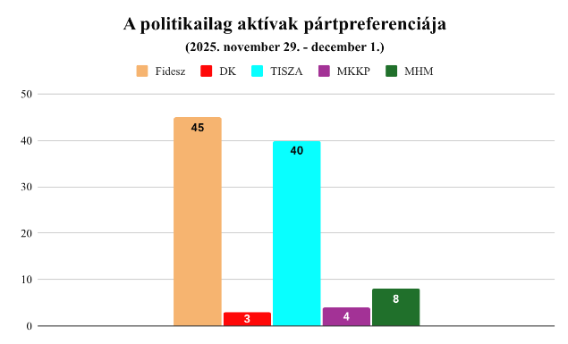A XXI. Század Intézet által november 29-e és december 1-je között végzett kutatása azt mutatja, hogy a Fidesz tovább tudott erősíteni a pozícióján (plusz egy százalékpontos javulás az október eleji méréshez képest), míg a Tisza rontott (mínusz egy pont). Az intézet szerint el lehet mondani, hogy az adatok alapján Magyar Péter pártja elérte a növekedési plafont, összegyűjtött minden korábbi ellenzéki protest szavazatot. Jelenleg az állás a politikailag aktívak bázisán:
