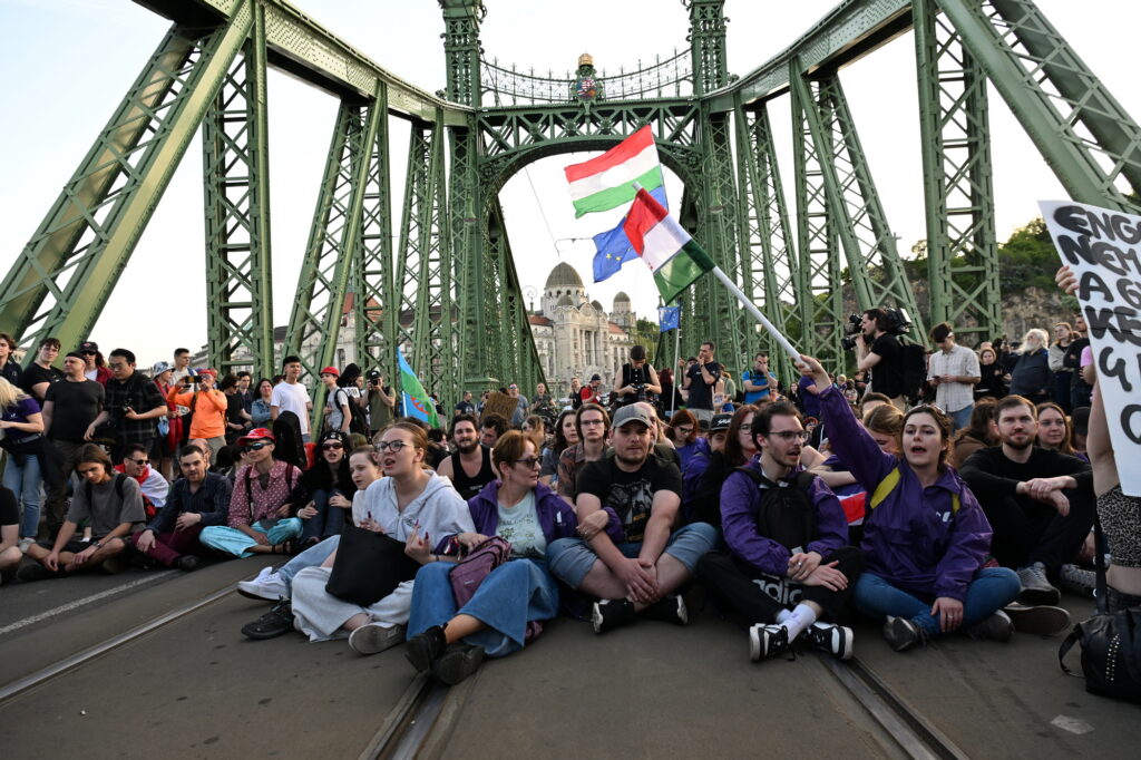 Címlapkép: Résztvevõk a gyülekezési jogról szóló törvény módosításának visszavonásáért tartott tüntetésen a Szabadság hídon 2025. április 22-én.