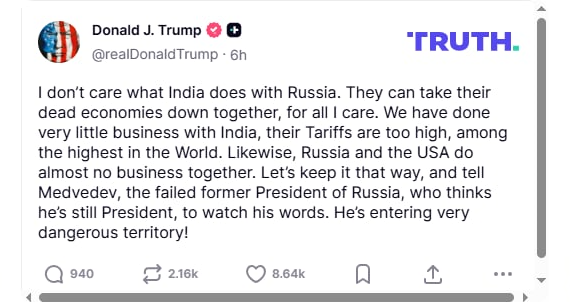 Az amerikai elnök közölte: „nem érdekli”, mit tesz India Oroszországgal, a két államról azt mondta, „gazdaságaik halottak”. Hangsúlyozta, hogy az Egyesült Államoknak „szinte semmilyen üzlete” nincs a két országgal, mondván: „Maradjon így.”