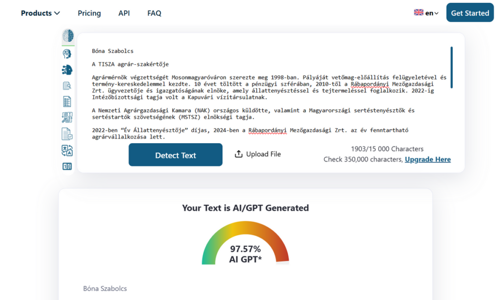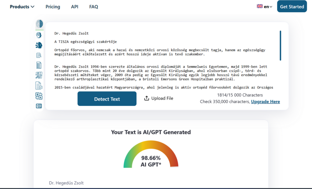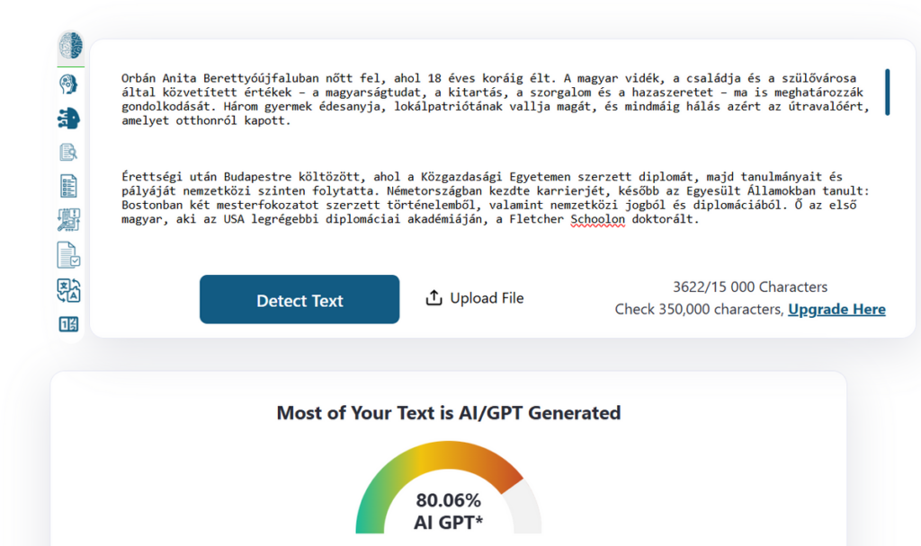 Amint az a fent mellékelt képen is látszik, Orbán Anita, a Tisza Párt legújabb igazolása sem volt képes önálló bemutatkozó írására, a szövegének 80 százaléka ugyanis mesterséges intelligenciával generált egy MI-detektor szerint.