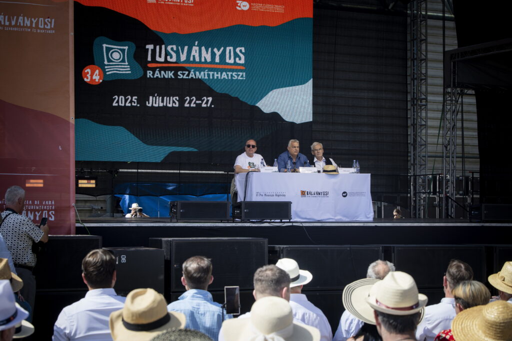 Borítókép: Orbán Viktor miniszterelnök (k) a 34. Bálványosi Nyári Szabadegyetem és Diáktáborban tartott politikai fórumon az erdélyi Tusnádfürdõn 2025. július 26-án. Mellette Tõkés László, az Erdélyi Magyar Nemzeti Tanács (EMNT) elnöke (j) és Németh Zsolt, az Országgyűlés külügyi bizottságának elnöke.